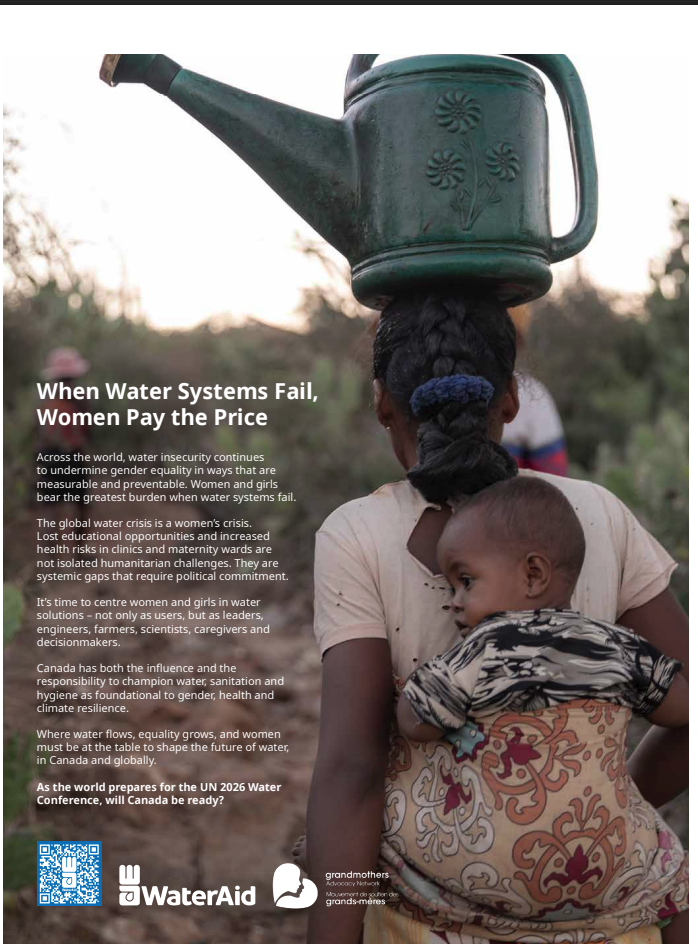 WaterAid Canada has taken out a full-page ad in the March 18 issue of The Hill Times to draw the attention of politicians and decision-makers to issues around gender and WASH. WaterAid has generously included our GRAN logo in their ad to highlight our partnership in this campaign. See poster at the bottom of this page.